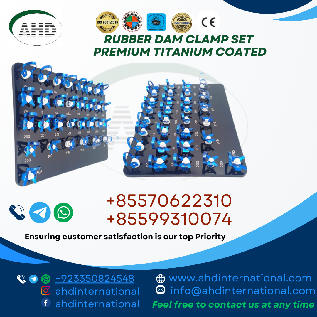 The Rubber Dam Clamp Set Titanium Coated Dental Isolation Instruments are precision-engineered to provide reliable tooth isolation during dental restorative and endodontic procedures. These clamps are manufactured from premium surgical-grade stainless steel and feature a titanium coating to enhance corrosion resistance, surface hardness, and longevity.